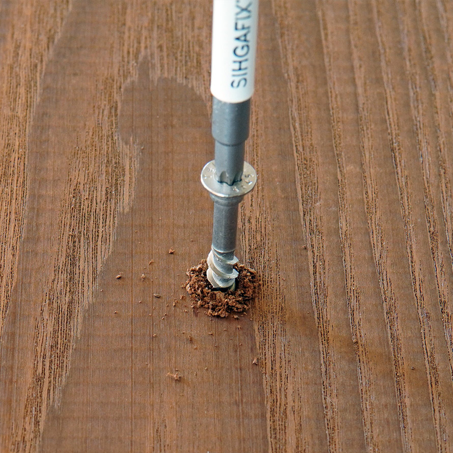 Die besondere Konstruktion der TeFix verhindert, dass das Holz während des Einschraubens splittert oder reißt. Der Reibschaft sorgt dafür, dass die Holzfasern schonend bearbeitet werden, während der flache Kopf gleichmäßigen Druck auf die Oberfläche ausübt. Dadurch wird die Integrität des Holzes gewahrt und ein ansprechendes Finish erzielt.