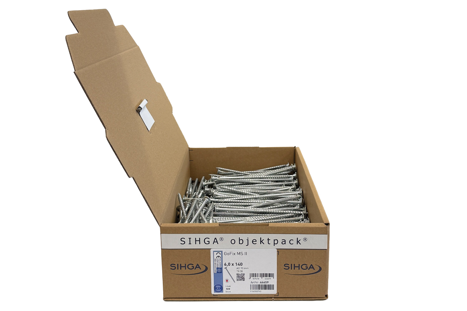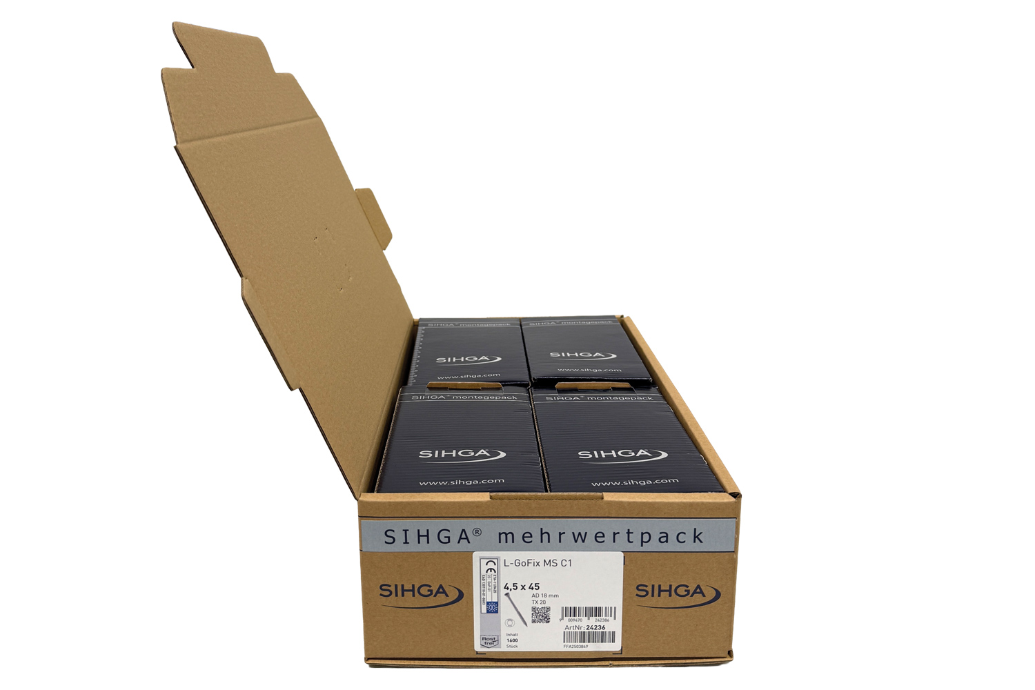 The SIHGA® minimontagepack was developed especially for assembly and resale. The contents are visible from the outside through a viewing window. The SIHGA® added mehrwertpack consists of four montagepacks and the SIHGA® objektpack® represents packing content for larger objects. The robust packaging is manufactured without sub-packing and with reduced lacquering of the cardboard boxes, making it particularly environmentally friendly.