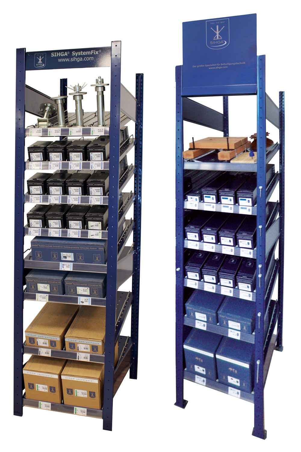 The SIHGA® SystemFix® presentation tool is filled with SIHGA® system packaging containing both the accessories required for assembly and assembly instructions. In this way, up to 160 SIHGA® assembly packs can be stored on less than half a square metre of floor space!