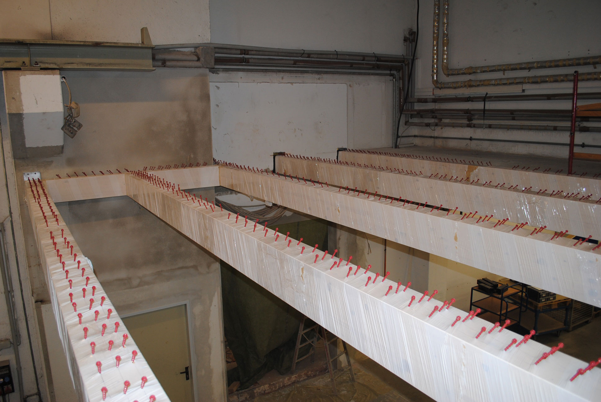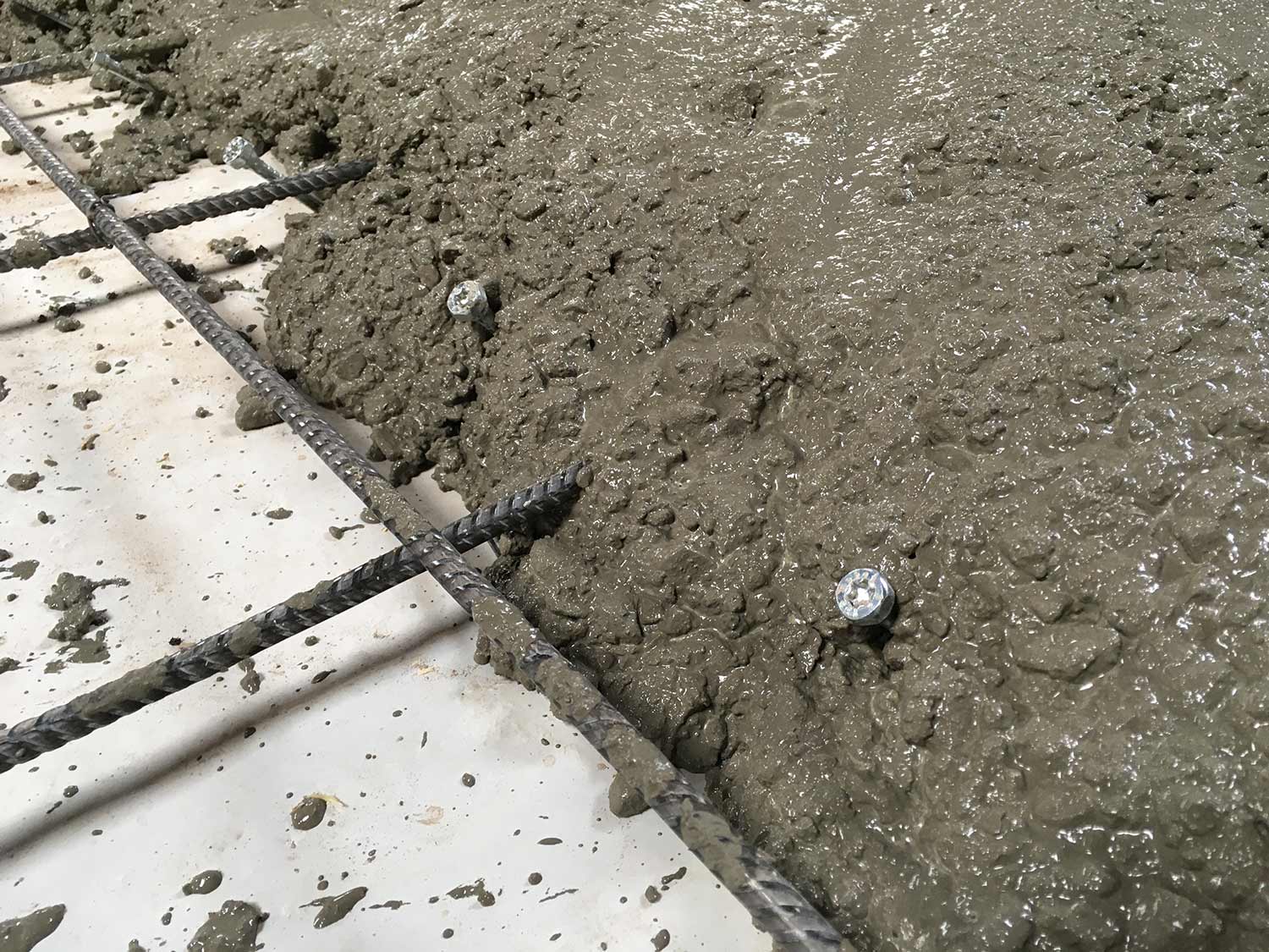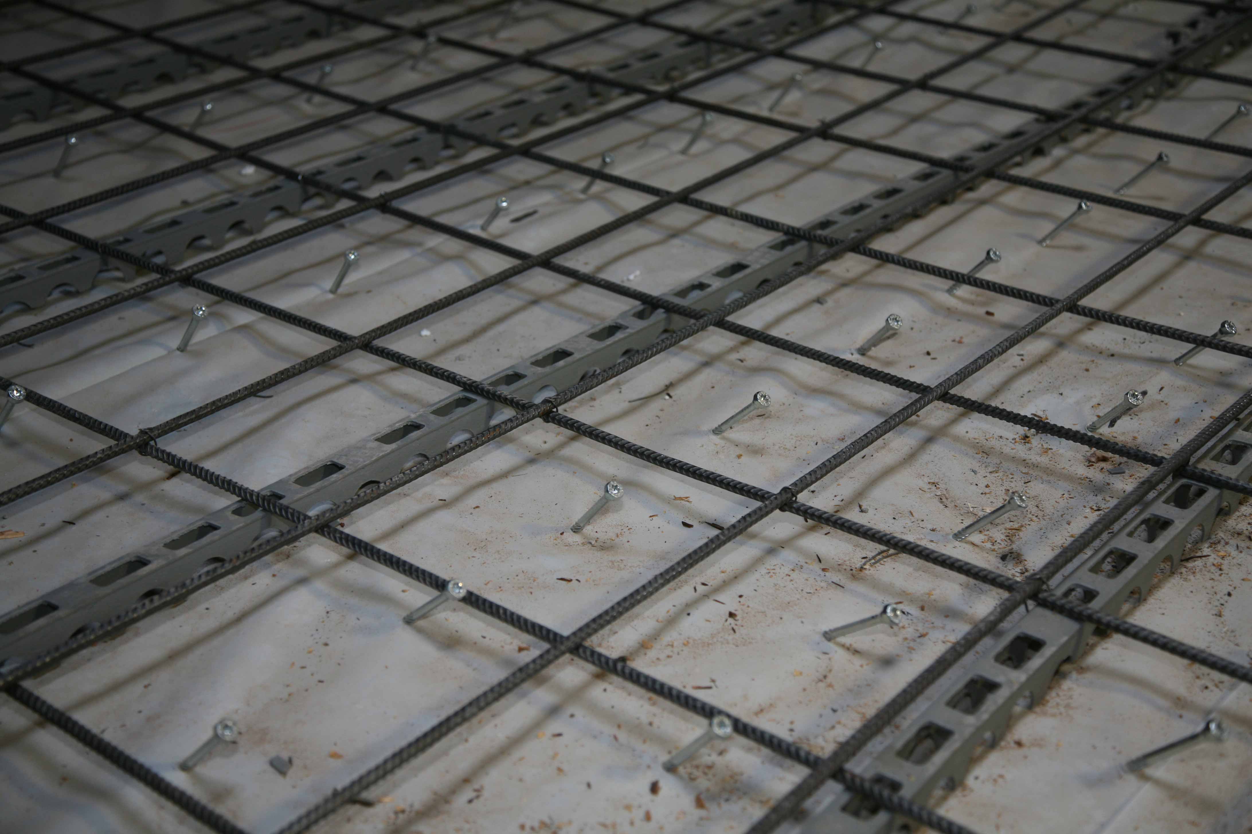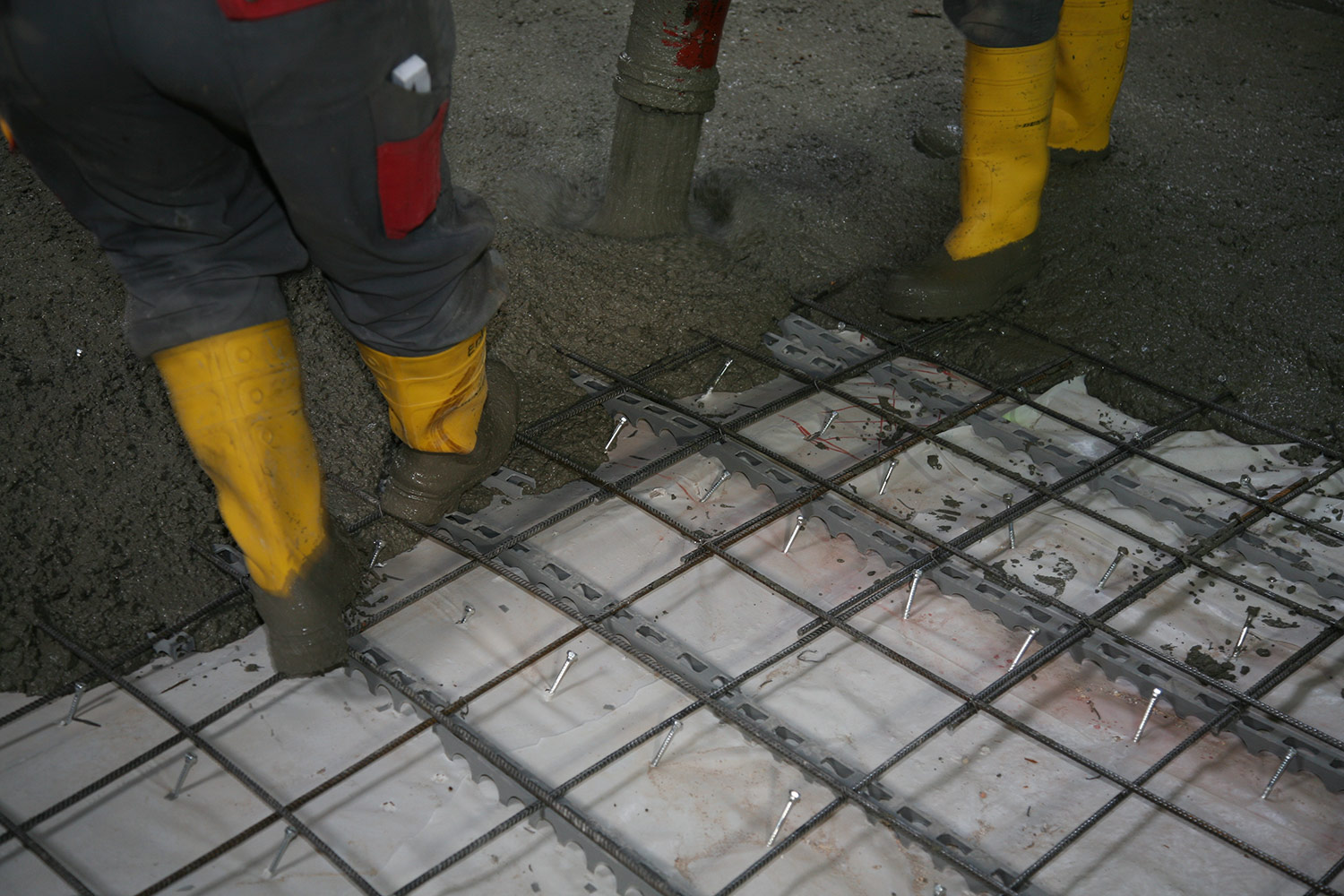 - Die Bewehrungsmatten werden aufgelegt. Das Raster der Matten (AQS 10*10 cm oder CQS 15*15 cm) sollte bei der Schraubenanordnung bereits berücksichtigt werden, um das Einbringen der Matten zu vereinfachen.