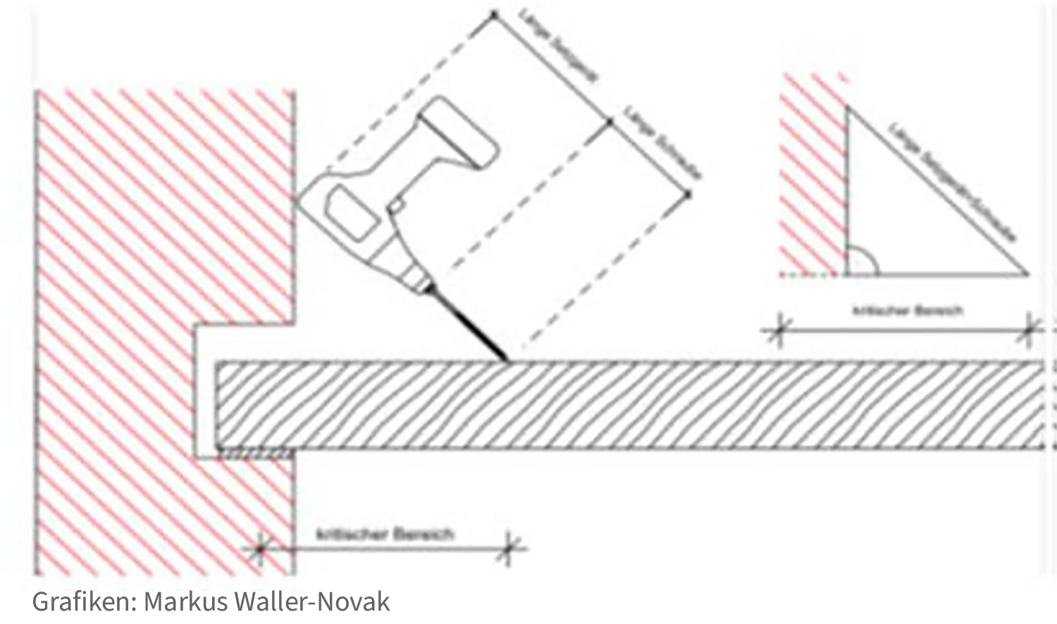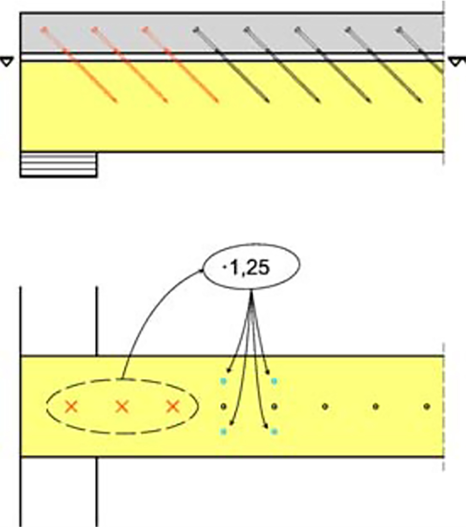 - Im Bereich der aufgehenden Wand ist eine schräge Verschraubung Mangels Platz für den Schrauber nicht möglich. Daher ist die Anzahl aller in diesem Bereich vorgesehenen Schrauben bei der nächstmöglichen Schraubstelle ergänzend einzubringen. Die Anzahl der ergänzenden Schrauben ist um den Faktor 1,25 zu erhöhen (siehe Grafiken)