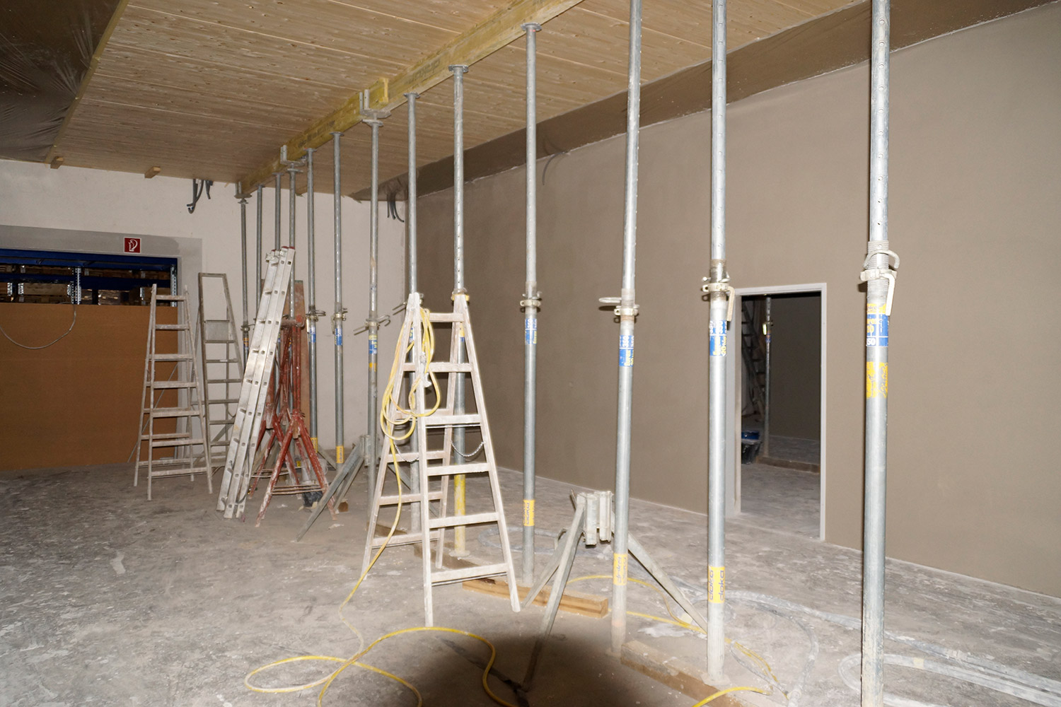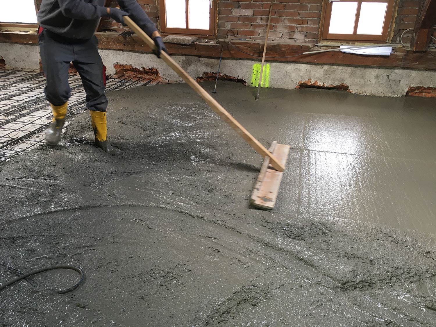 - Vor der Betoneinbringung muss die Holzbalkendecke unterstellt werden, um eine zusätzliche Durchbiegung durch das Eigengewicht des Betons zu vermeiden.