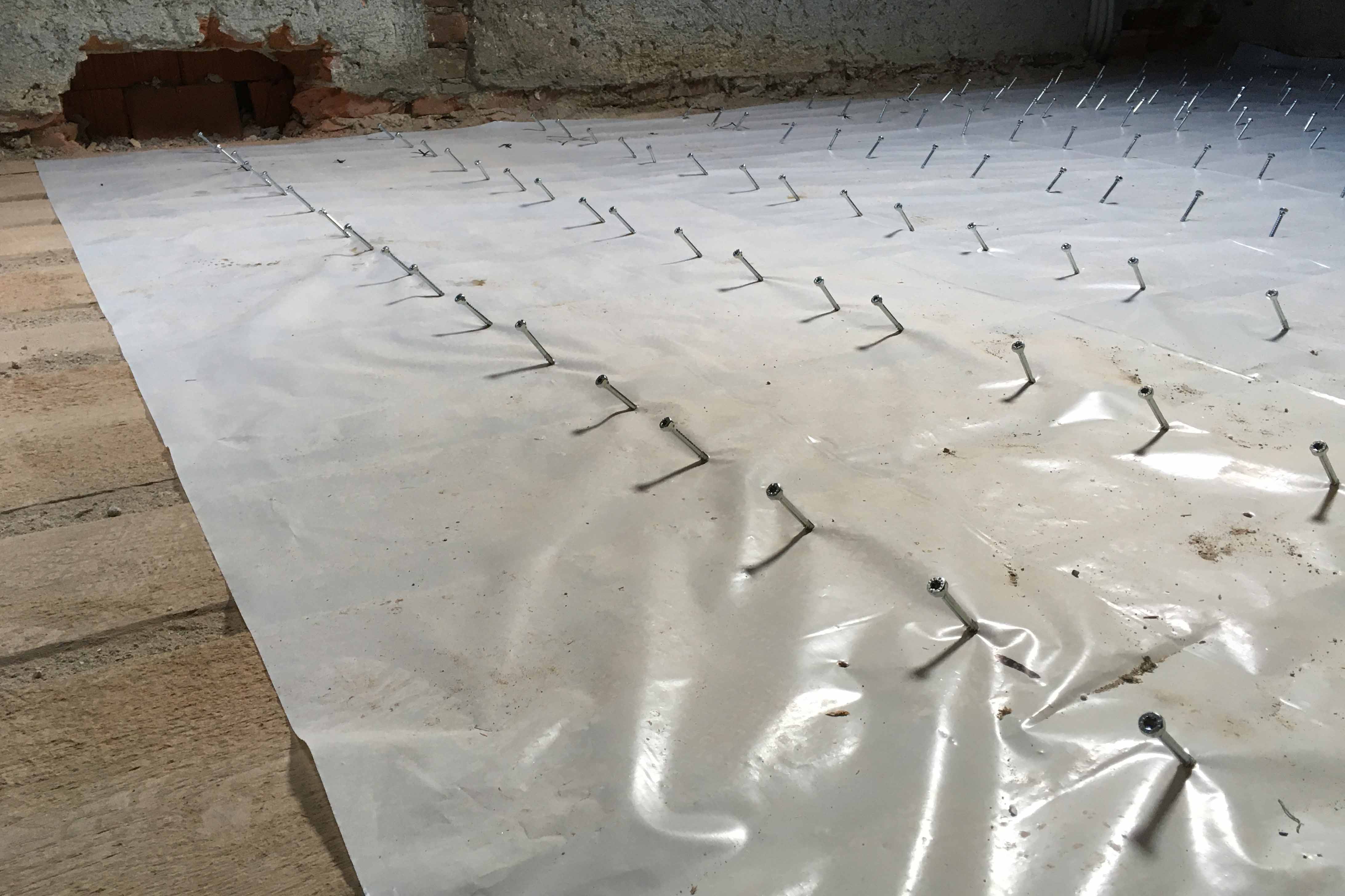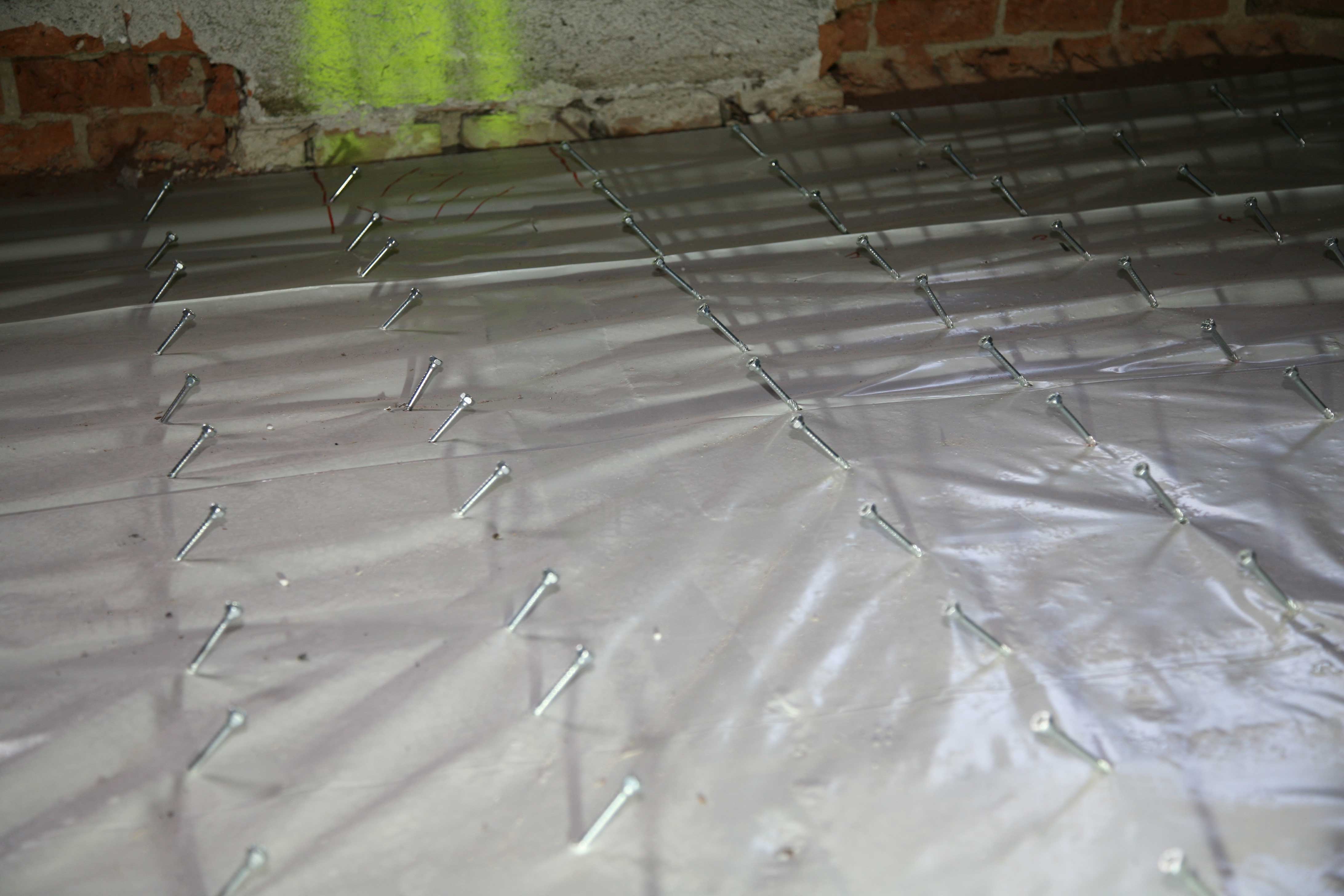 - Auf die bestehenden Balken bzw. die Holzschalung wird eine Folie als Trennlage aufgelegt