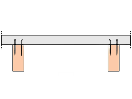 - Die Schrauben sind unter einem Winkel von 45° (+/- 5°) in Spannrichtung einzubringen und auf Zug zu beanspruchen (Schrauben neigen sich in Richtung Auflager). Die Schraube muss mindestens mit 65 mm in der Betonebene liegen.