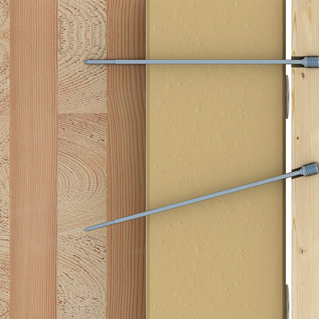 Das wichtigste Element der Schraube ist die Justierhülse am Schraubenkopf. Diese ist am Kopf der Schraube frei drehbar gelagert und weist ein Gewinde auf, das bei der Montage in die Lattung der Fassaden-UK eingedreht wird. Zuerst werden nur jene Schrauben montiert, die im rechten Winkel zur Gebäudewand liegen. Mit dem Sechskant am Setzwerkzeug kann durch drehen der Justierhülse die Holzlattung genau in die Vertikale eingerichtet werden. Speziell bei unebenen Wänden kann so eine perfekte Ebene hergestellt werden. Abschließend werden die schrägen Schrauben gesetzt und somit tragfähige Knoten ausgebildet.