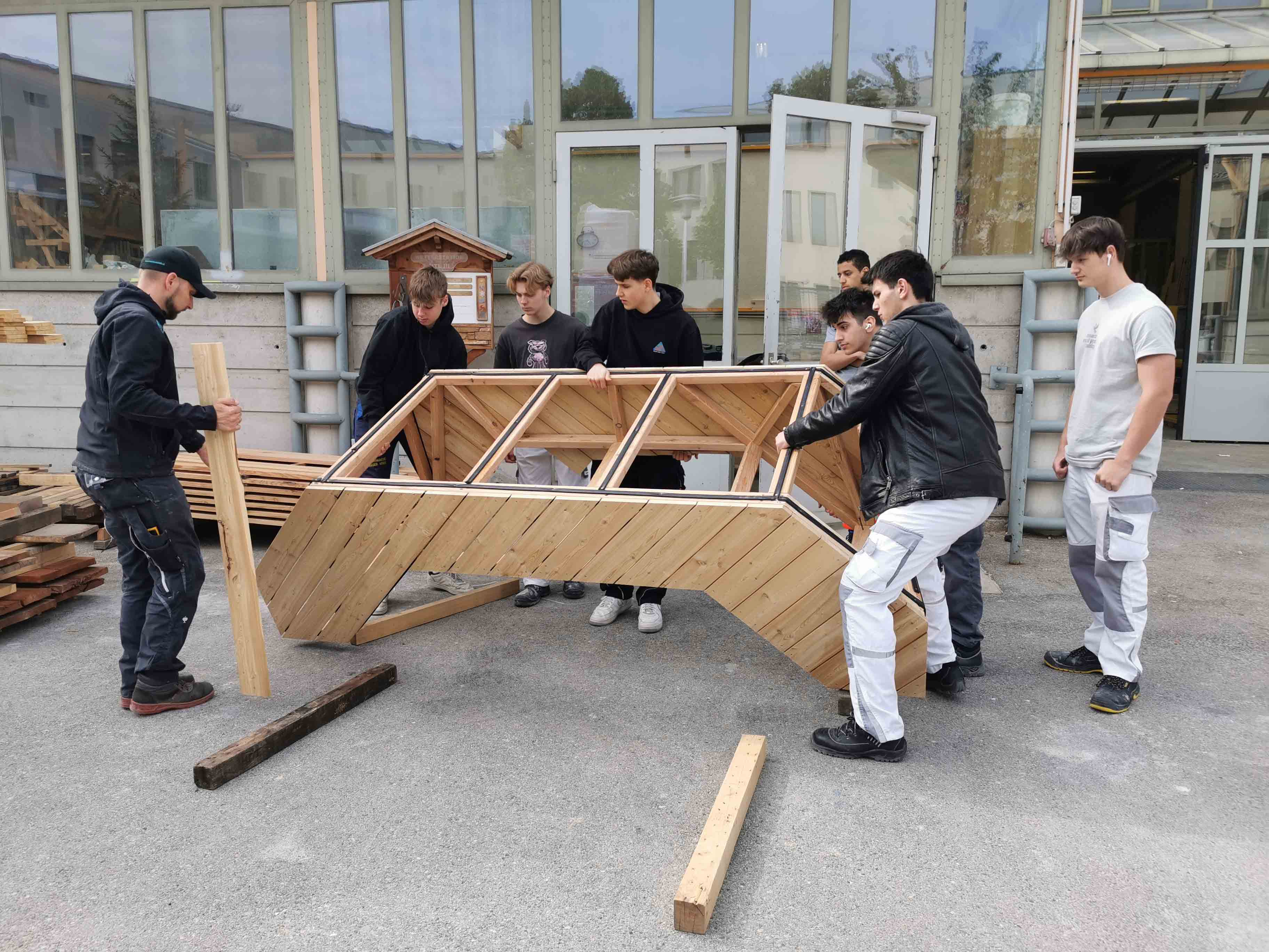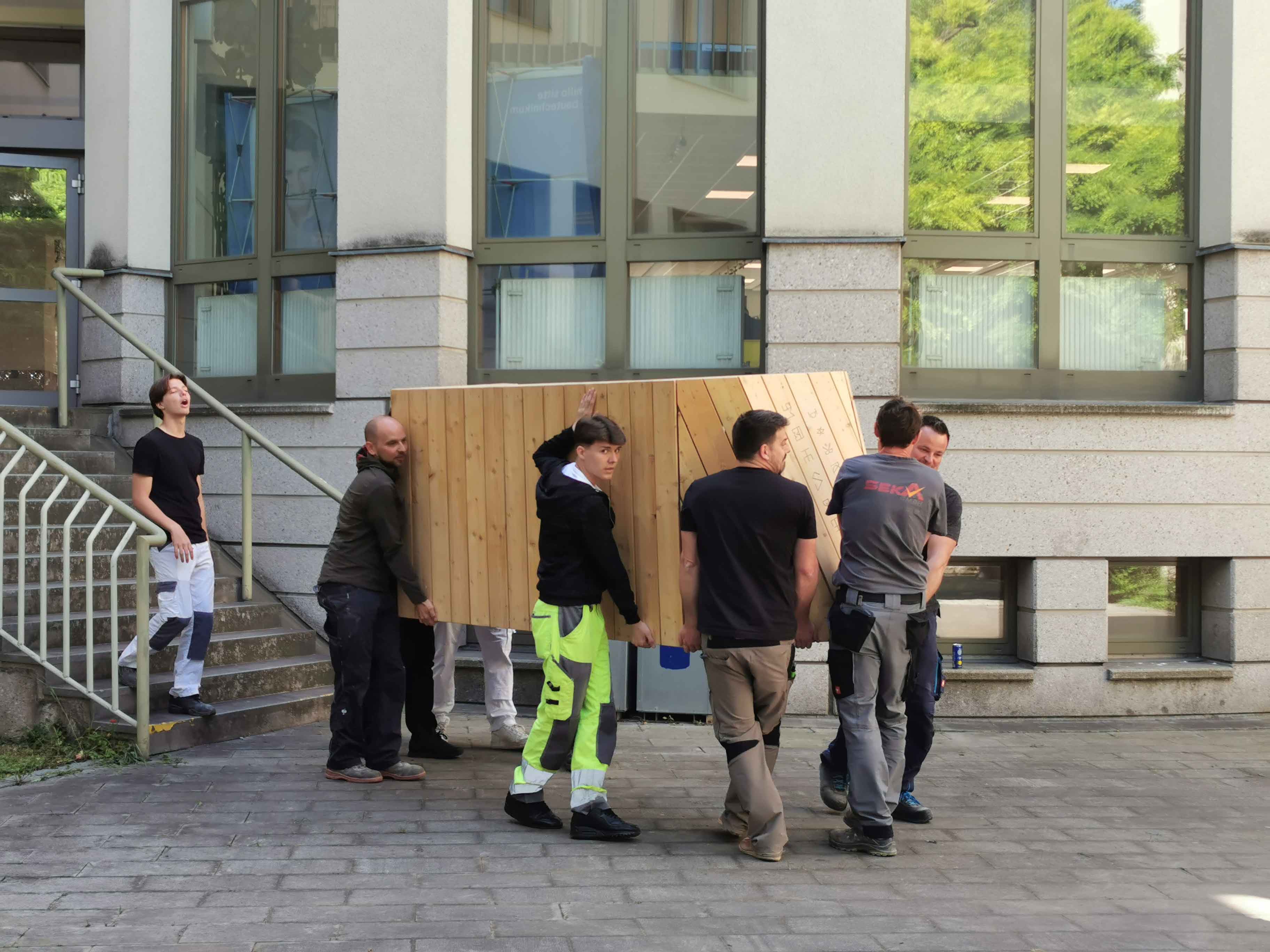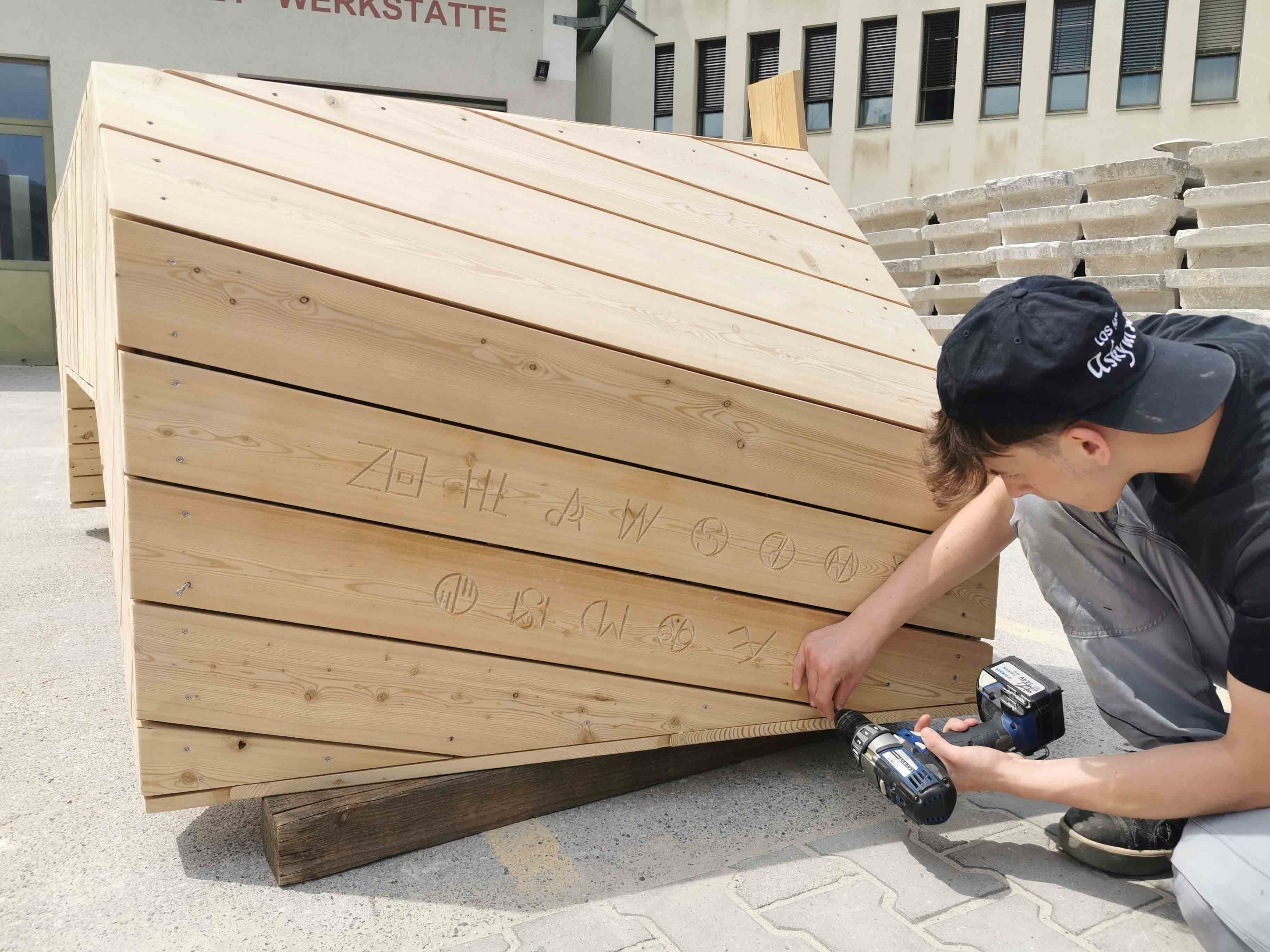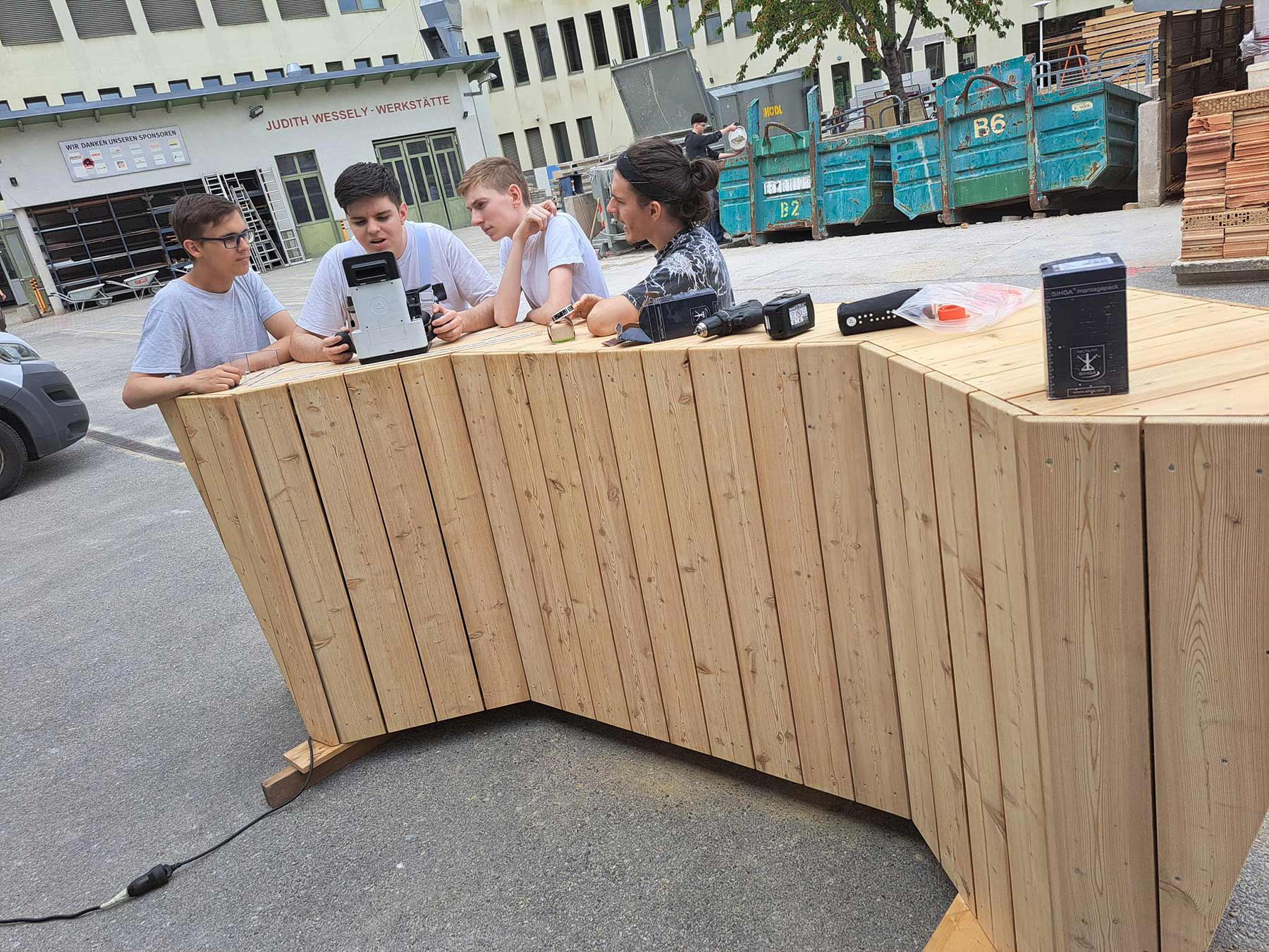Der Antrieb bei PPAG anzufragen, entstand daraus, das Schul-und Lernumfeld am Camillo Sitte Bautechnikum lebensfreundlicher zu gestalten. Im Gespräch mit einem Zimmermann, der in der Werkstatt unterrichtet, reifte die Idee die Enzis in Holz zu transferieren.